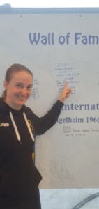 Prämiert wurde diese Leistung mit einer Flasche Wein. Denn der Wettkampf in Gau-Algesheim zeichnet sich unter anderem dadurch aus, dass die jeweils Erstplatzierten in ihrer AK statt einer Goldmedaille eine Flasche Wein (oder Traubensaft) erhalten. Ebenso durfte sich Sabine mit ihren Rekord auf der Wall of Fame verewigen.